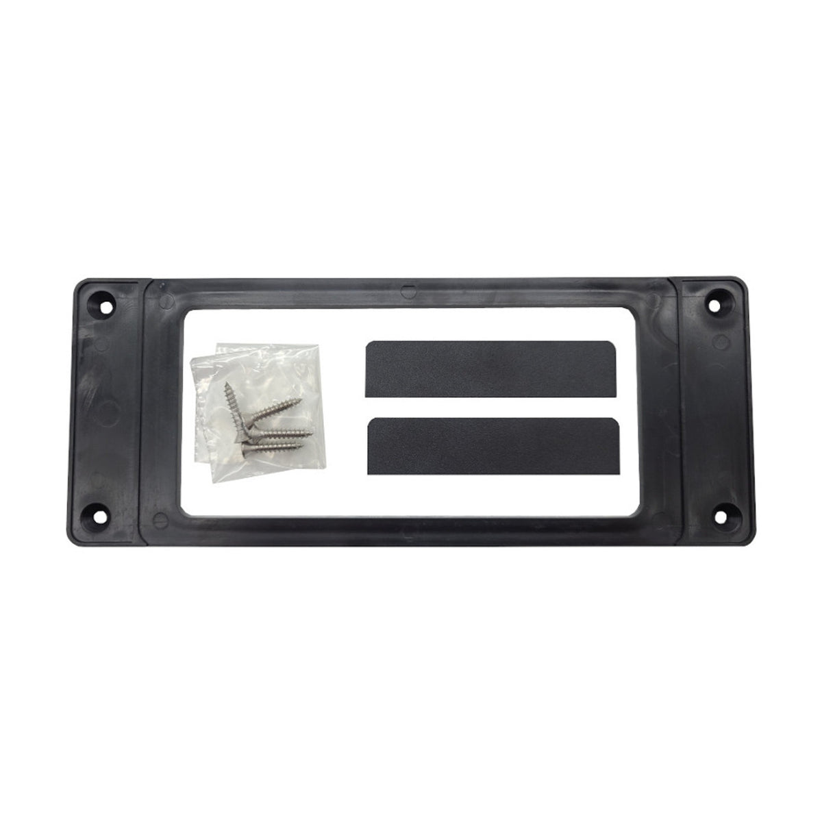 - Includes 4 screws and two black rectangular adhesive overlays used to cover the screw holes