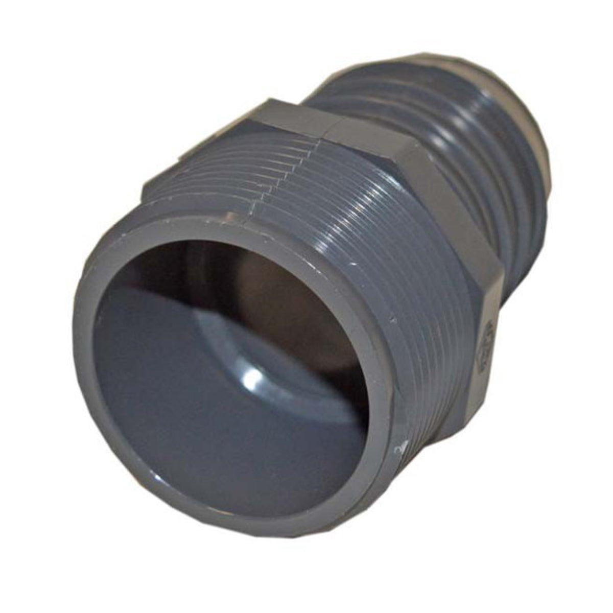 PVC pool and hot tub plumbing adaptor with 1.5" MPT threads and 1.5" barbed insert on opposite end.