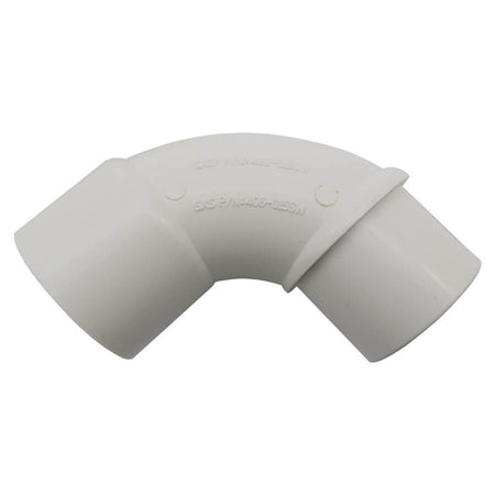 The 1.5” inch sweep 90 elbow for pool and spa plumbing has a slip (S) on one end and spigot (SPG) on the other end. The slip ends of this 90 degree PVC elbow are designed to fit over a white flex hose or schedule 40 rigid pipe for the pool and spa industry referenced as 2” or plumbing parts with a 2” inch spigot end. The spigot end of this sweep 90 elbow is designed to fit inside a fitting referenced as a 1.5-inch slip with an actual inside diameter of 1-7/8”. It's important to note that in the pool and hot tub industry, plumbing dimensions are referred to as nominal sizes rather than actual sizes.