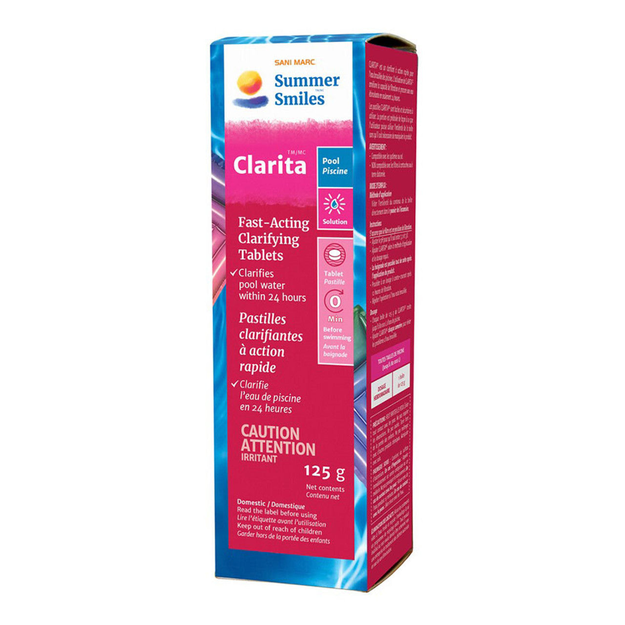 Sani Marc Clarita is a fast-acting clarifier that can quickly resolve cloudy pool water and improve filtration. It can typically leave water crystal clear in just 24 hours. Clarita tabs come in pre-measured tablet doses, making them easy to use. No direct product handling is required, making it safer for users.