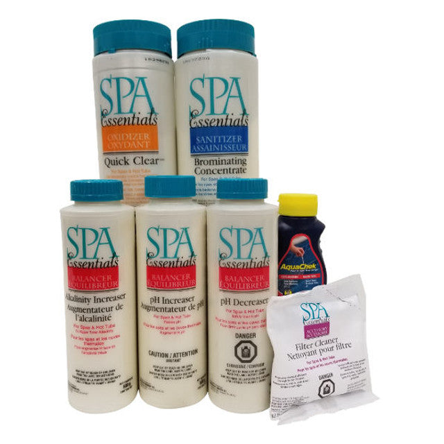 Spa Essentials hot tub starter kit includes the basics in this convenient Spa Essentials Bromine based starter kit for hot tubs on city water. For hot tubs that are on well or lake water at a cottage, additional products may be required to treat contminans that are not present in treated city water. Available with granular bromine or bromine tablets.